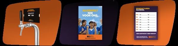 Het sportpakket bevat materialen om te ondersteunen bij de naleving van de leeftijdsgrens bij de verkoop van alcohol in de sportkantine. In dit pakket zitten twee posters en een tapruiter. Met de NIX18-poster voor sportclubs laat je als club zien dat je de NIX18-norm uitdraagt. Met de schenktijdenposter geef je aan wanneer er alcohol wordt geschonken. Op de tapruiter kun je makkelijk zien vanaf welke datum iemand ouder is dan 18 jaar. Dit helpt barvrijwilligers bij het controleren van de leeftijd.